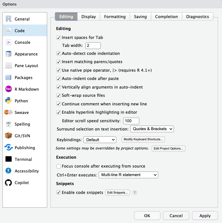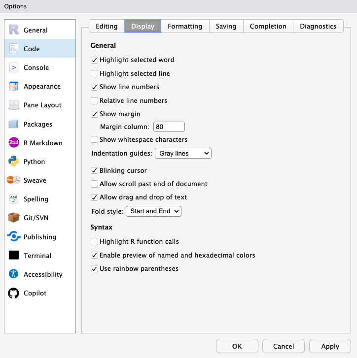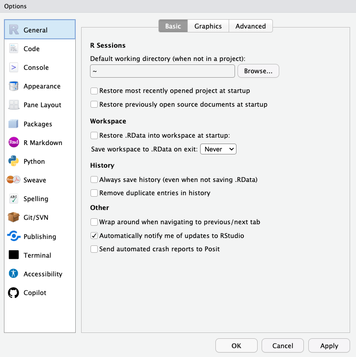 You can change some settings to make your life easier when working in RStudio. The following steps are all done in the same menu. Go to Tools > Global Options.