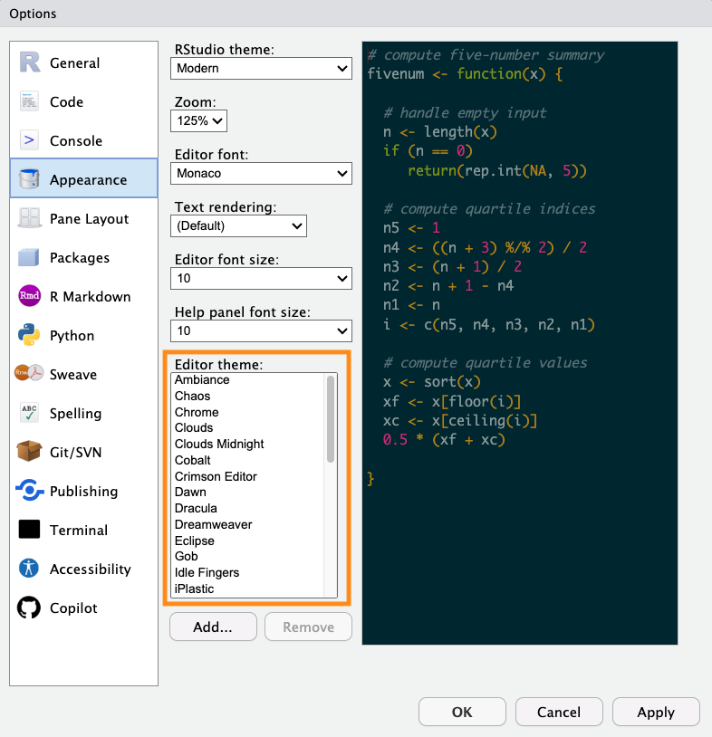 You don’t have to stick with the boring RStudio color scheme! Go to Appearance and select the color scheme you want.