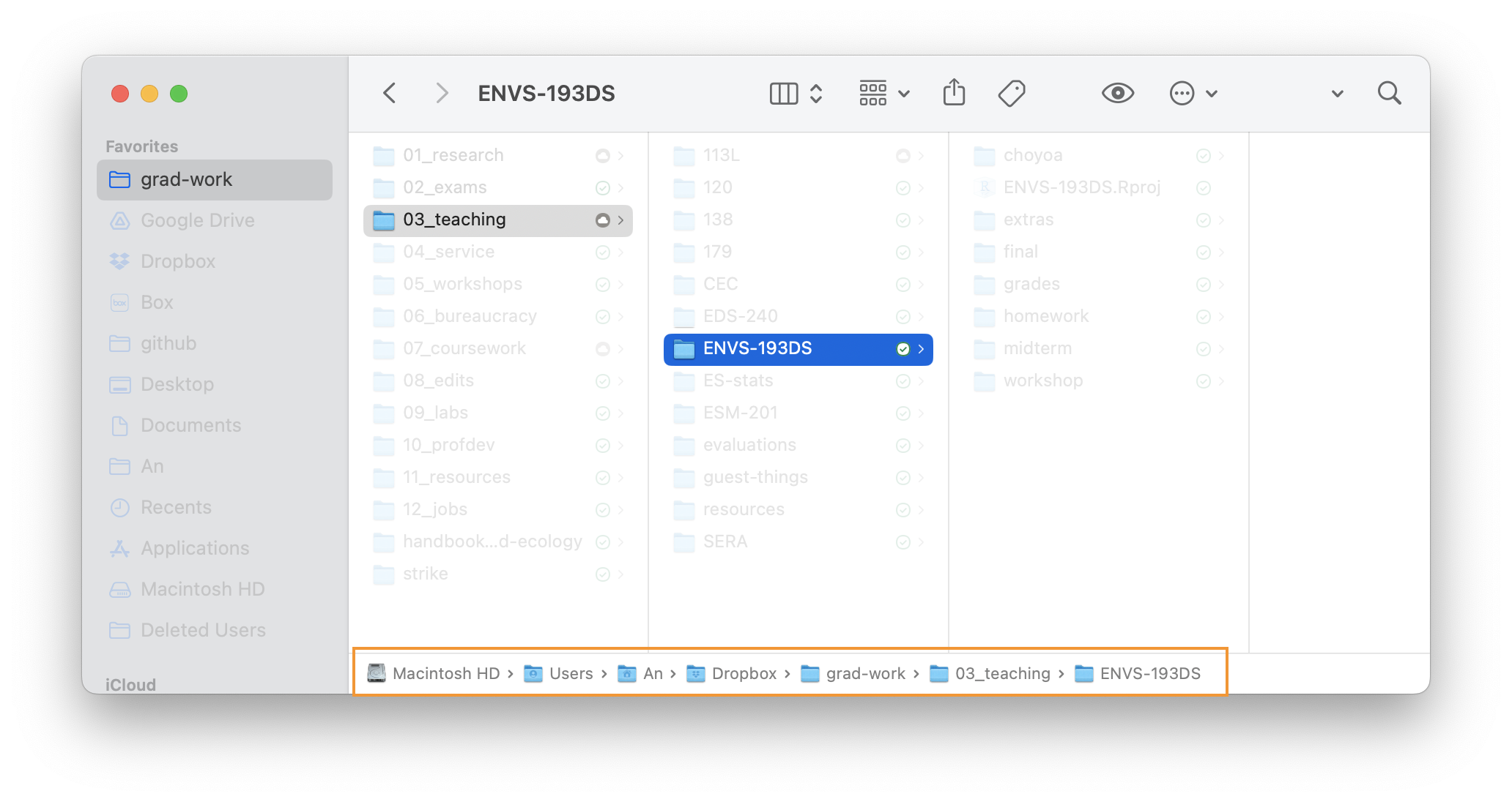 You can check this using the file path, or the folders you would need to open to get to the folder called ENVS-193DS. One example for MacOS is below, where the file path is shown at the bottom of the pane: