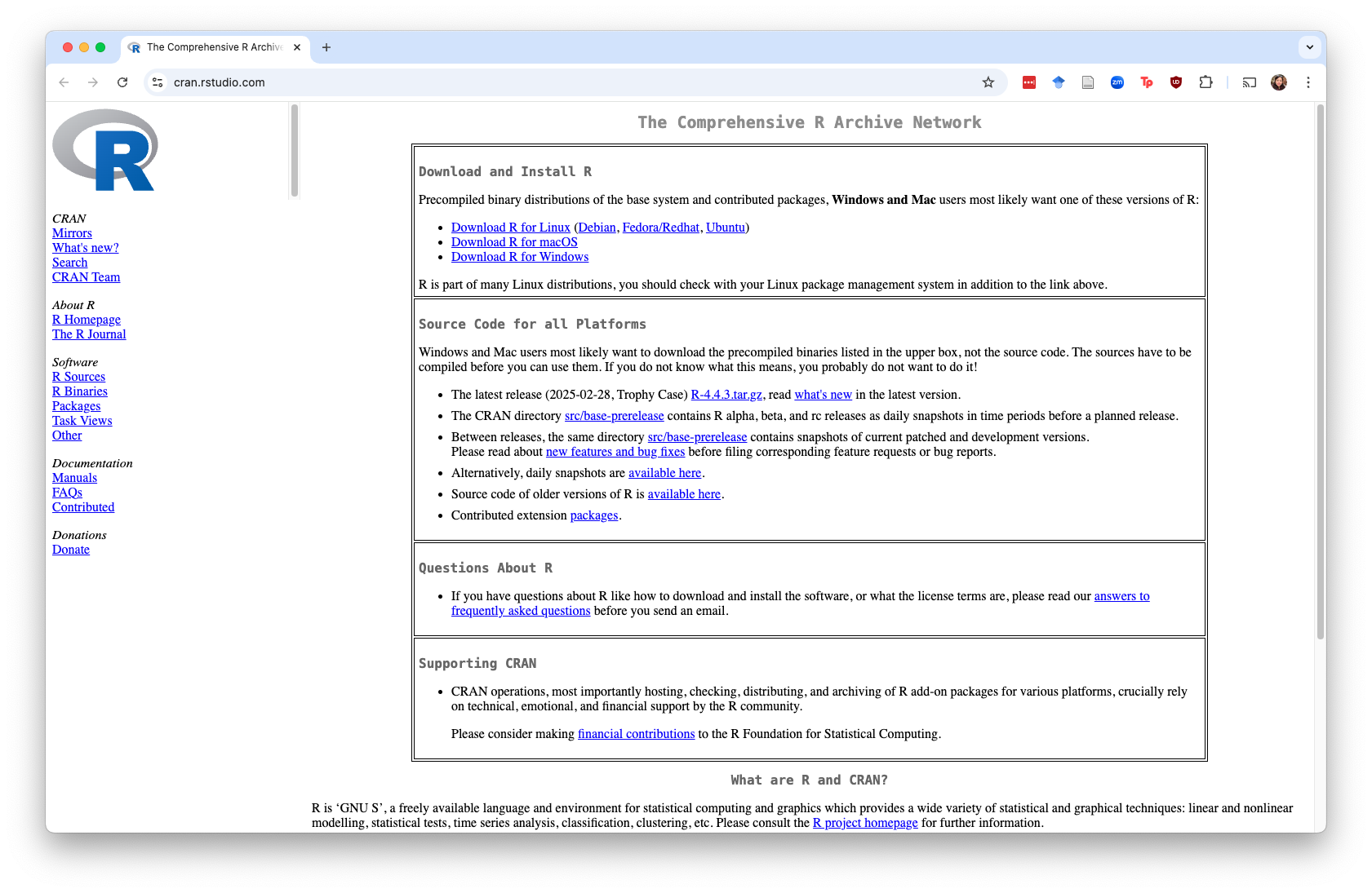Go to posit.co/download/rstudio-desktop. Click on the button under “2: Install RStudio”. It should automatically show the correct version for your operating system.
