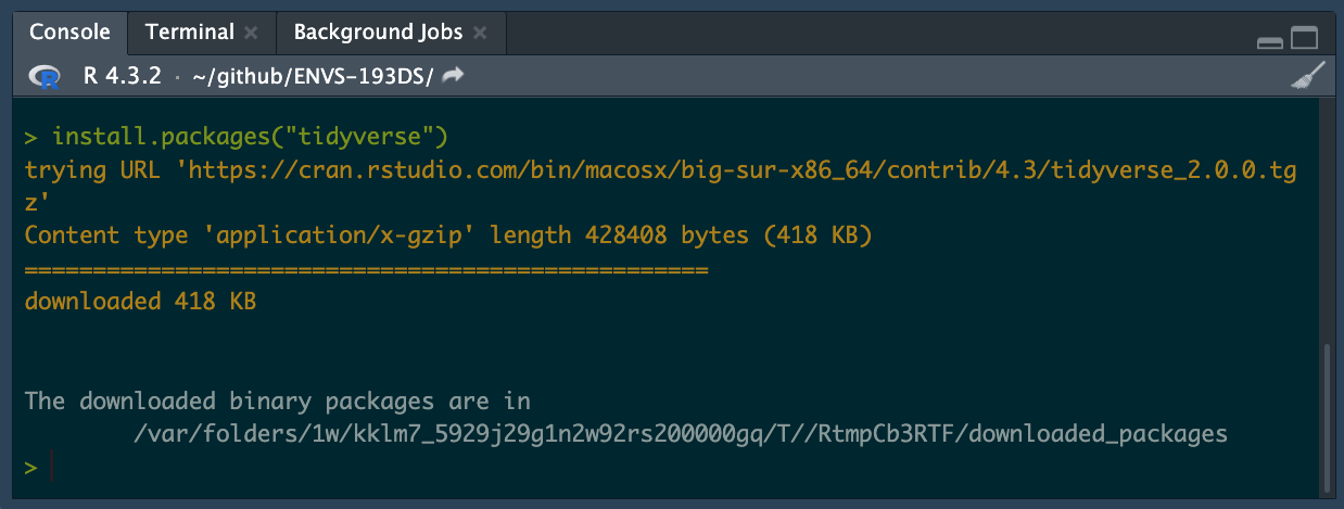 The database that holds all these packages will automatically detect which version you need based on your operating system. Don’t worry if your output message doesn’t look exactly the same as the one here - just as long as you get something like “The downloaded binary packages are in…”, you’ve probably got the package installed.