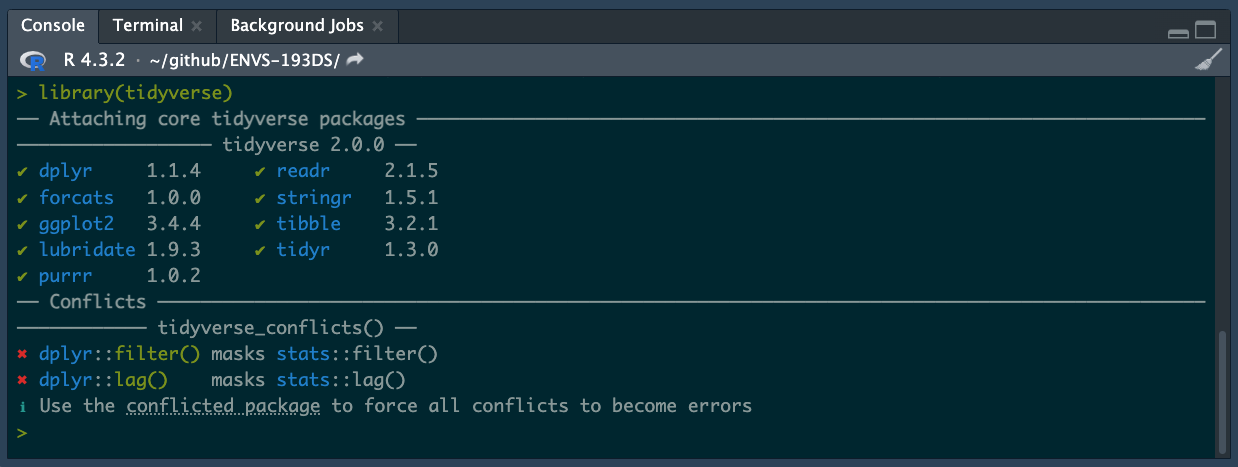 Now you’ve installed a package, but you want to make sure you can actually run it. Again in the Console (the bottom left pane), type library(tidyverse) and hit Enter.