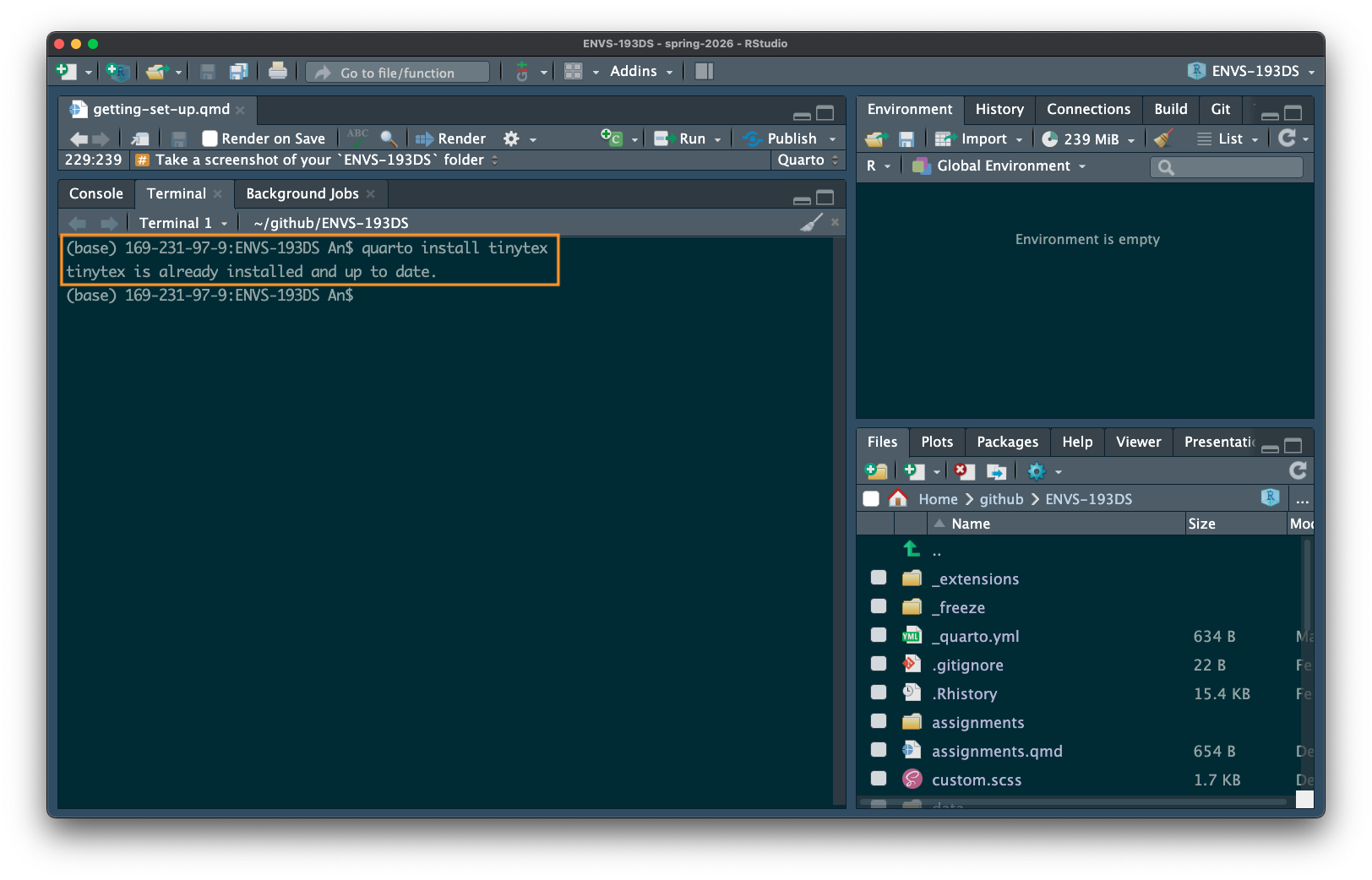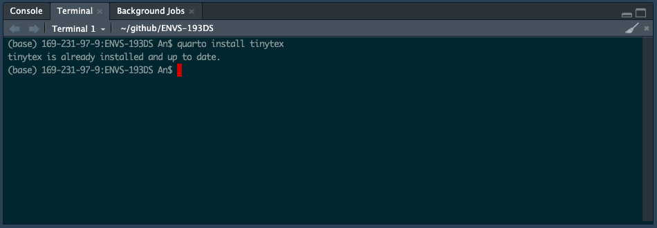 On my (An’s) computer, I see the message tinytex is already installed and up to date. You may see a different message, or be prompted to do different things. That is ok!