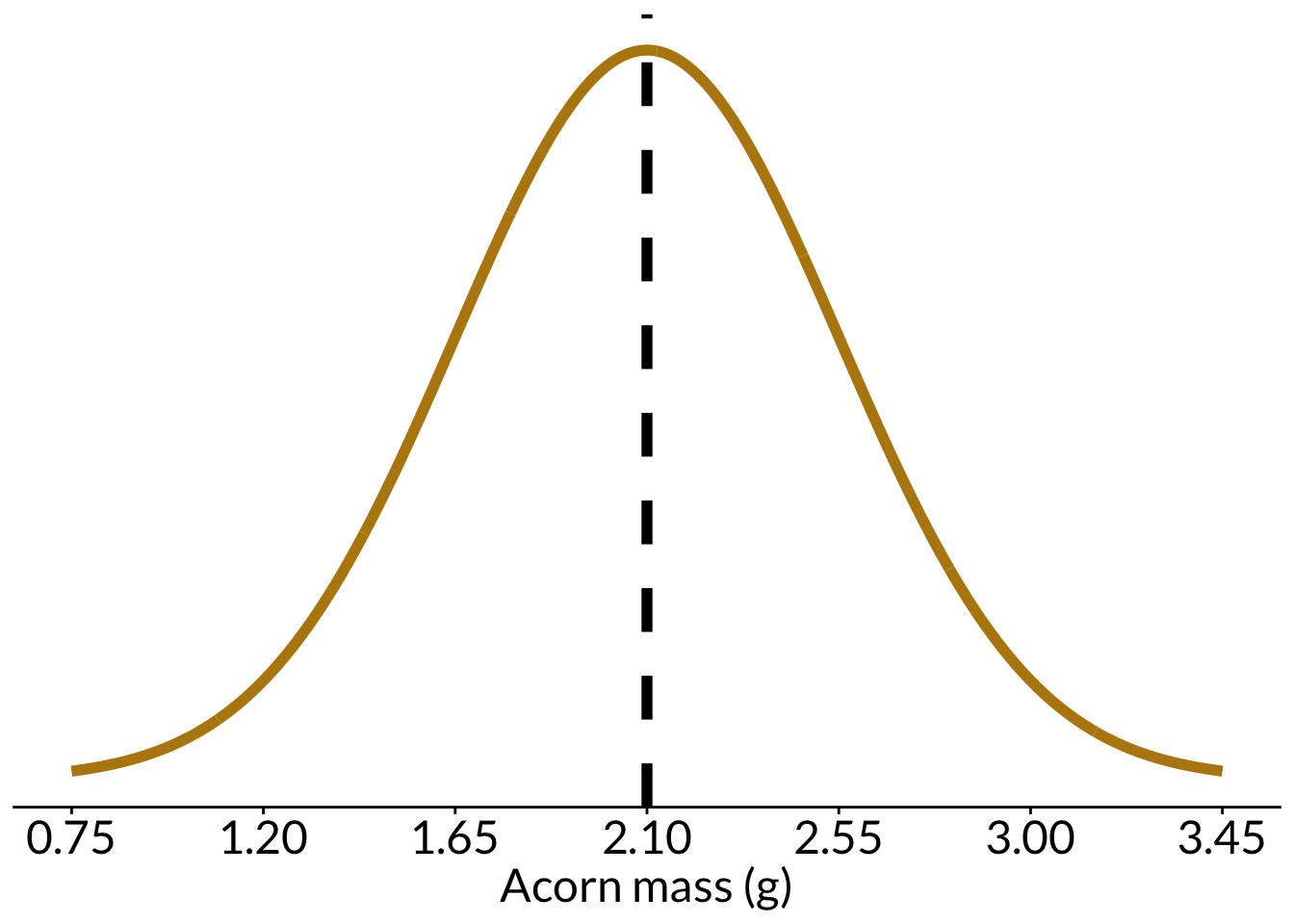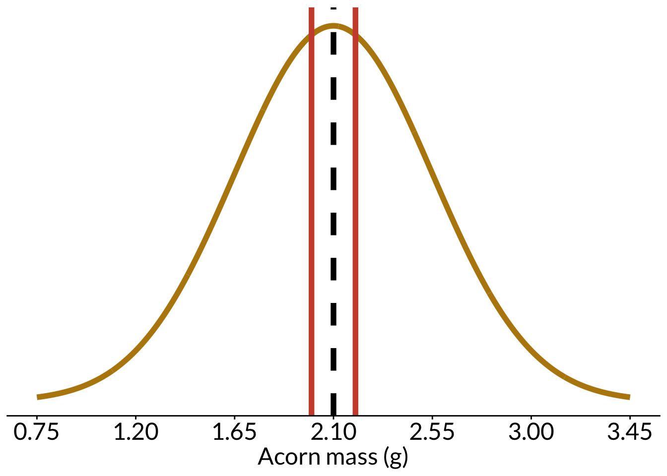 You then choose to randomly sample 30 acorns and calculate the sample mean: $\bar{y} = 2.6 g$. You also (miraculously) know the population standard deviation: $\sigma = 0.3 g$.