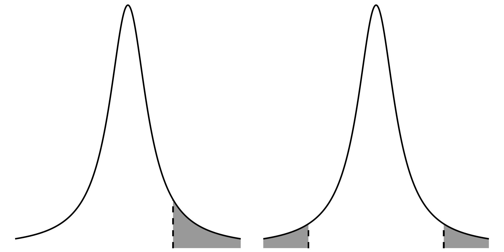 In a one-tailed test (directional, greater or lesser), all the significance is in one tail of the distribution. In a two-tailed test (not directional, different from), the significance is split between two tails of the distribution.