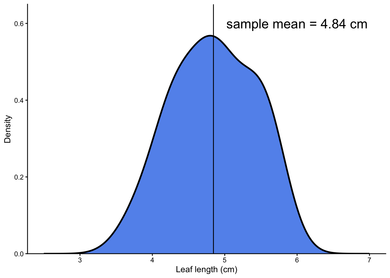 annotate("text", x = 6, y = 0.6, label = "sample mean = 4.84 cm", size = 6) +