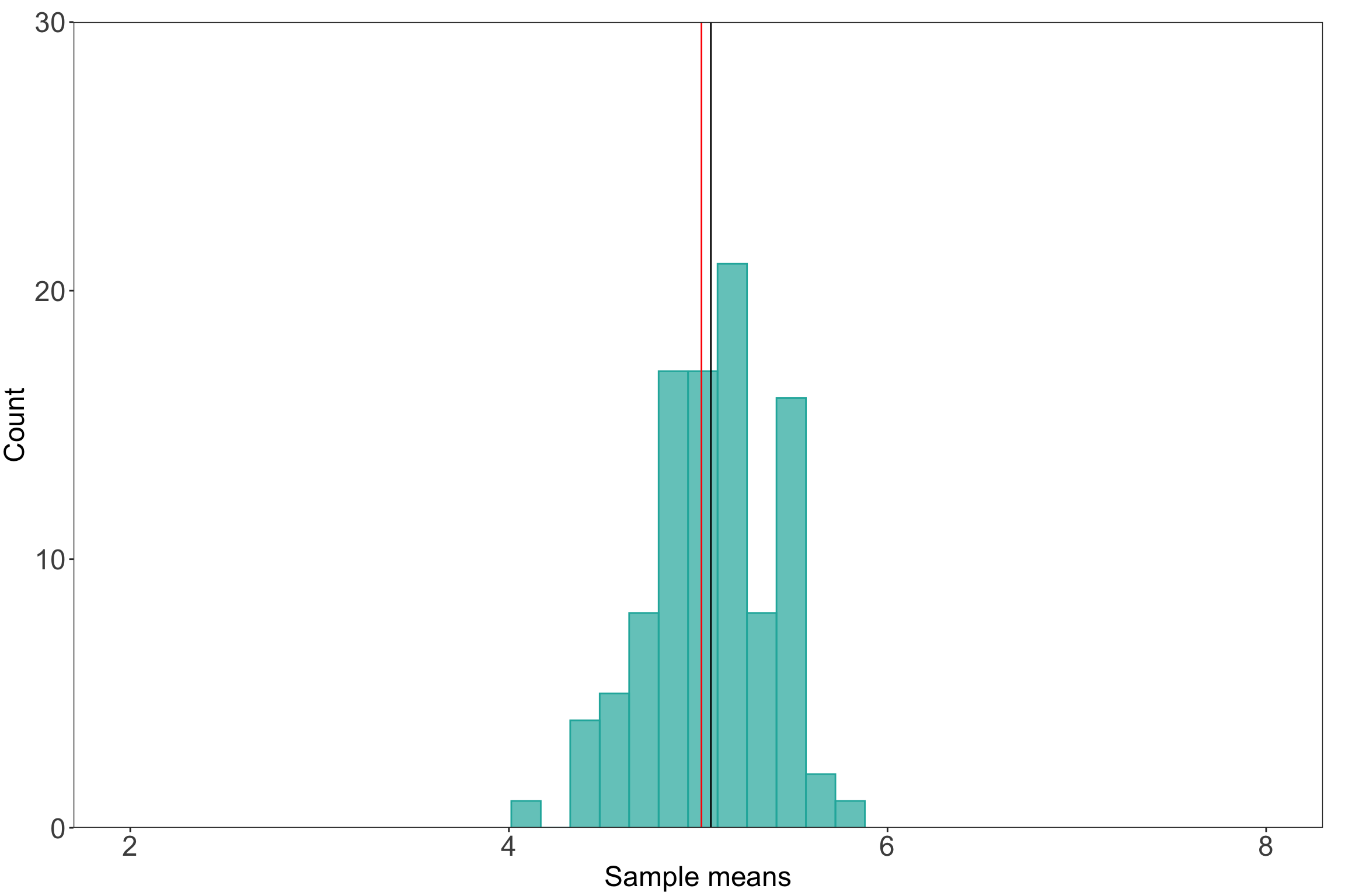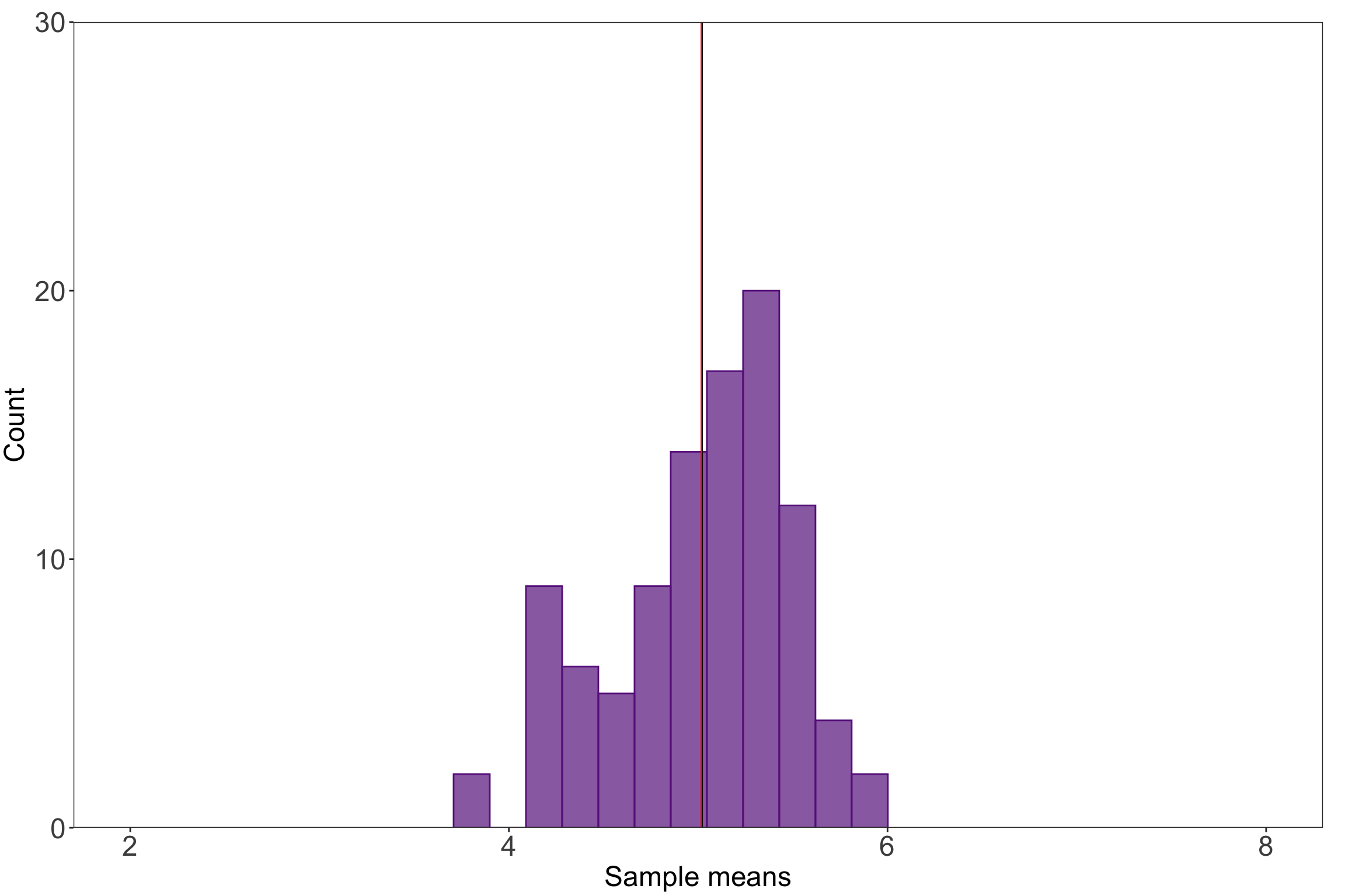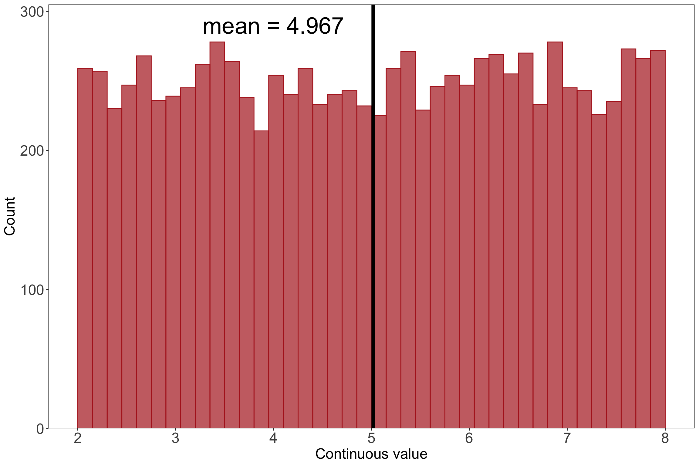 # randomly select 10000 numbers from a uniform distribution for the populationuniform <-runif(10000, min =2, max =8)# make a histogram for the populationuniformdf <-as.data.frame(uniform)ggplot(uniformdf, aes(x = uniform)) +geom_histogram(breaks =seq(2, 8, length.out =41), fill ="firebrick", alpha =0.7, color ="firebrick") +geom_vline(xintercept =mean(uniform), linewidth =2) +annotate("text", x =4, y =290, label ="mean = 4.967", size =10) +scale_x_continuous(breaks =seq(from =2, to =8, by =1)) +scale_y_continuous(expand =c(0, 0), limits =c(0, 305)) +labs(x ="Continuous value", y ="Count") +theme_bw() +theme(panel.grid =element_blank(),axis.text =element_text(size =18),axis.title =element_text(size =18))