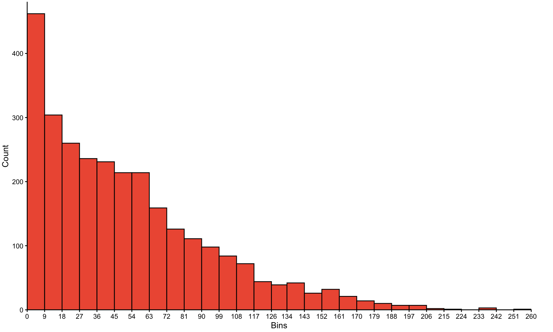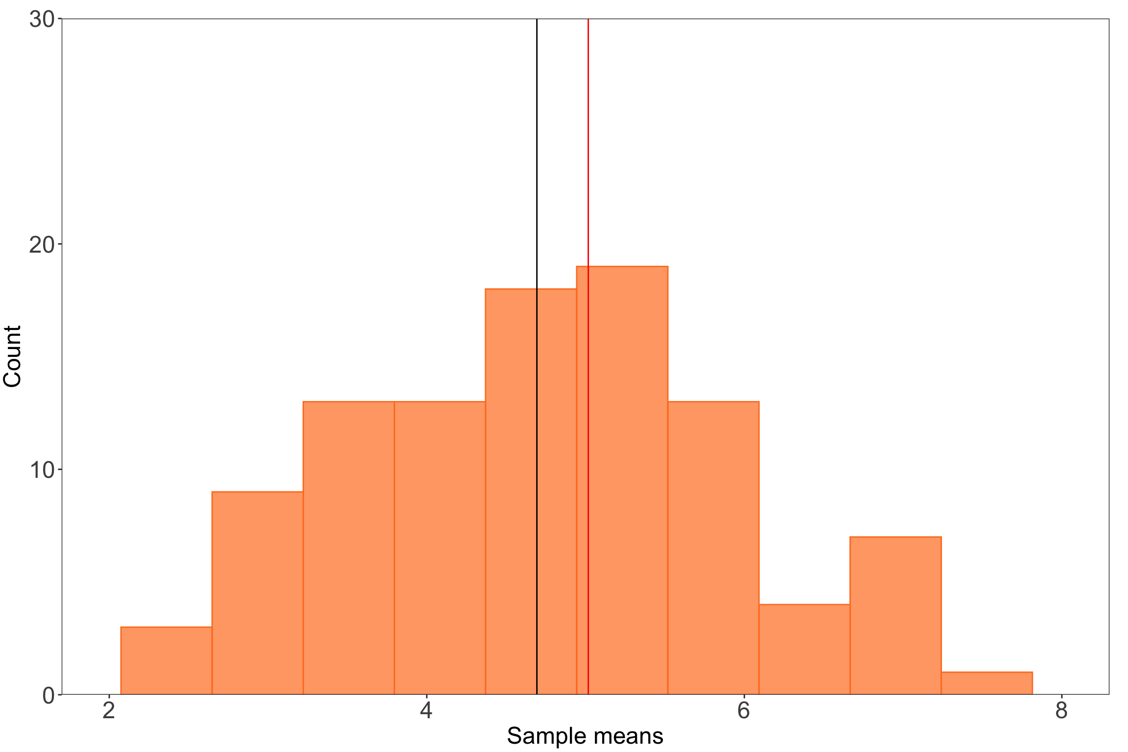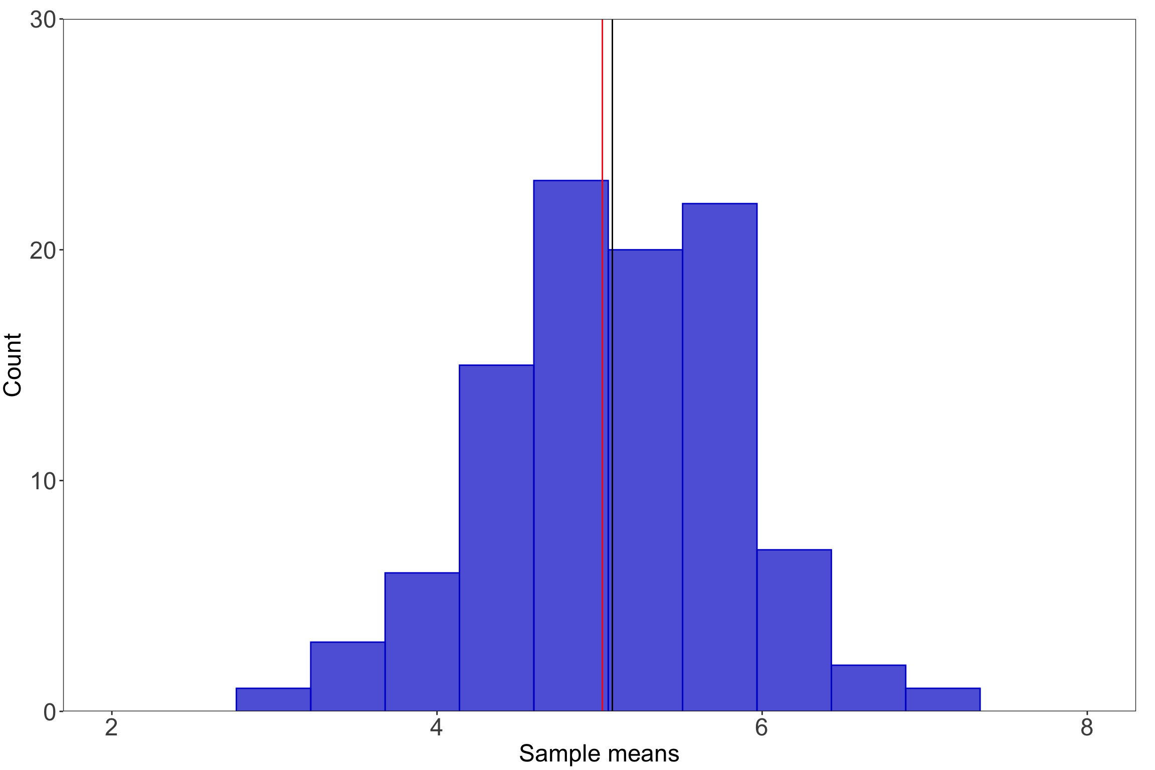 # randomly select 10000 numbers from a uniform distribution for the populationuniform <-runif(10000, min =2, max =8)# make a histogram for the populationuniformdf <-as.data.frame(uniform)ggplot(uniformdf, aes(x = uniform)) +geom_histogram(breaks =seq(2, 8, length.out =41), fill ="firebrick", alpha =0.7, color ="firebrick") +geom_vline(xintercept =mean(uniform), linewidth =2) +annotate("text", x =4, y =290, label ="mean = 4.967", size =10) +scale_x_continuous(breaks =seq(from =2, to =8, by =1)) +scale_y_continuous(expand =c(0, 0), limits =c(0, 305)) +labs(x ="Continuous value", y ="Count") +theme_bw() +theme(panel.grid =element_blank(),axis.text =element_text(size =18),axis.title =element_text(size =18))