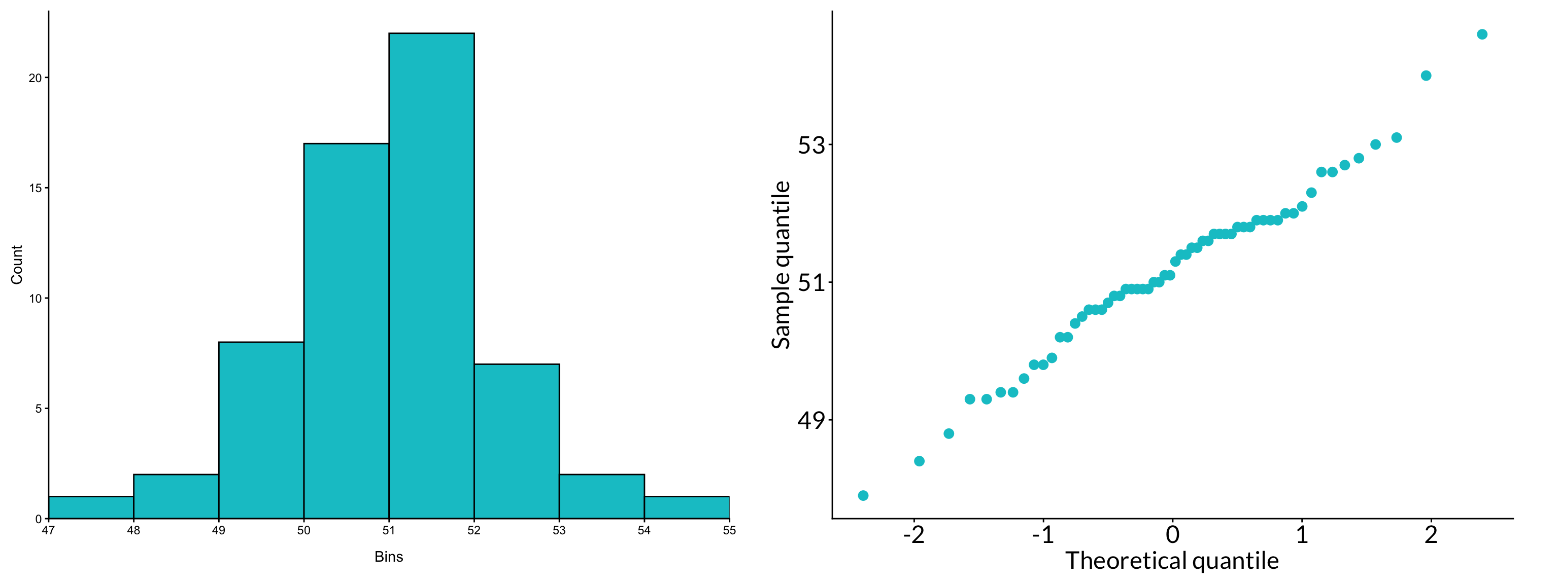 set.seed(666)pig_weights <-rnorm(n =40, mean =49, sd =4)mean(pig_weights)