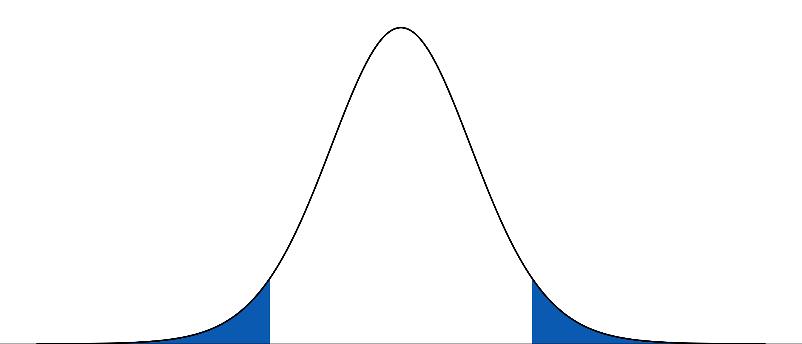 ggplot(data.frame(x =-5:5), aes(x)) +stat_function(geom ="area", fun = dt, args =list(df =19), xlim =c(1.8, 5), fill ="#0070c0") +stat_function(geom ="area", fun = dt, args =list(df =19), xlim =c(-5, -1.8), fill ="#0070c0") +stat_function(geom ="line", n =1000, fun = dt, args =list(df =19), linewidth =1, color ="#000000") +geom_hline(yintercept =0) +scale_y_continuous(expand =c(0, 0), limits =c(0, 0.4)) +theme_void() +theme(panel.grid =element_blank(),plot.margin =unit(c(1, 0, 0, 0), "cm"))