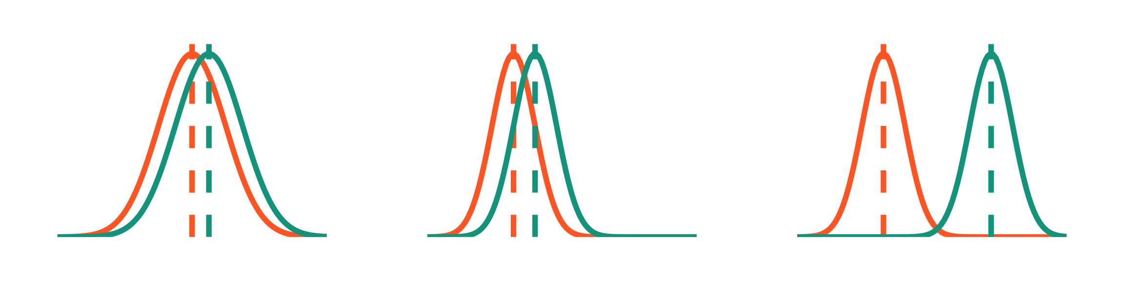 small <-ggplot(data.frame(x =-6:9), aes(x)) +stat_function(geom ="line", n =100, fun = dnorm, args =list(mean =0, sd =2), linewidth =2, color ="#FF6B2B") +geom_vline(aes(xintercept =0), color ="#FF6B2B", lty =2, linewidth =2) +stat_function(geom ="line", n =100, fun = dnorm, args =list(mean =3, sd =2), linewidth =2, color ="#0070C0") +geom_vline(aes(xintercept =3), color ="#0070C0", lty =2, linewidth =2) +scale_y_continuous(expand =c(0, 0), limits =c(0, 0.21)) +theme_void() +theme(plot.margin =unit(c(1, 1, 1, 1), "cm"))big <-ggplot(data.frame(x =-6:9), aes(x)) +stat_function(geom ="line", n =100, fun = dnorm, args =list(mean =0, sd =0.5), linewidth =2, color ="#FF6B2B") +geom_vline(aes(xintercept =0), color ="#FF6B2B", lty =2, linewidth =2) +stat_function(geom ="line", n =100, fun = dnorm, args =list(mean =3, sd =0.5), linewidth =2, color ="#0070C0") +geom_vline(aes(xintercept =3), color ="#0070C0", lty =2, linewidth =2) +scale_y_continuous(expand =c(0, 0), limits =c(0, 0.8)) +theme_void() +theme(plot.margin =unit(c(1, 1, 1, 1), "cm"))diff <-ggplot(data.frame(x =-6:9), aes(x)) +stat_function(geom ="line", n =100, fun = dnorm, args =list(mean =0, sd =0.5), linewidth =2, color ="#FF6B2B") +geom_vline(aes(xintercept =0), color ="#FF6B2B", lty =2, linewidth =2) +stat_function(geom ="line", n =100, fun = dnorm, args =list(mean =3, sd =1.25), linewidth =2, color ="#0070C0") +geom_vline(aes(xintercept =3), color ="#0070C0", lty =2, linewidth =2) +scale_y_continuous(expand =c(0, 0), limits =c(0, 0.85)) +theme_void() +theme(plot.margin =unit(c(1, 1, 1, 1), "cm"))small / big / diff