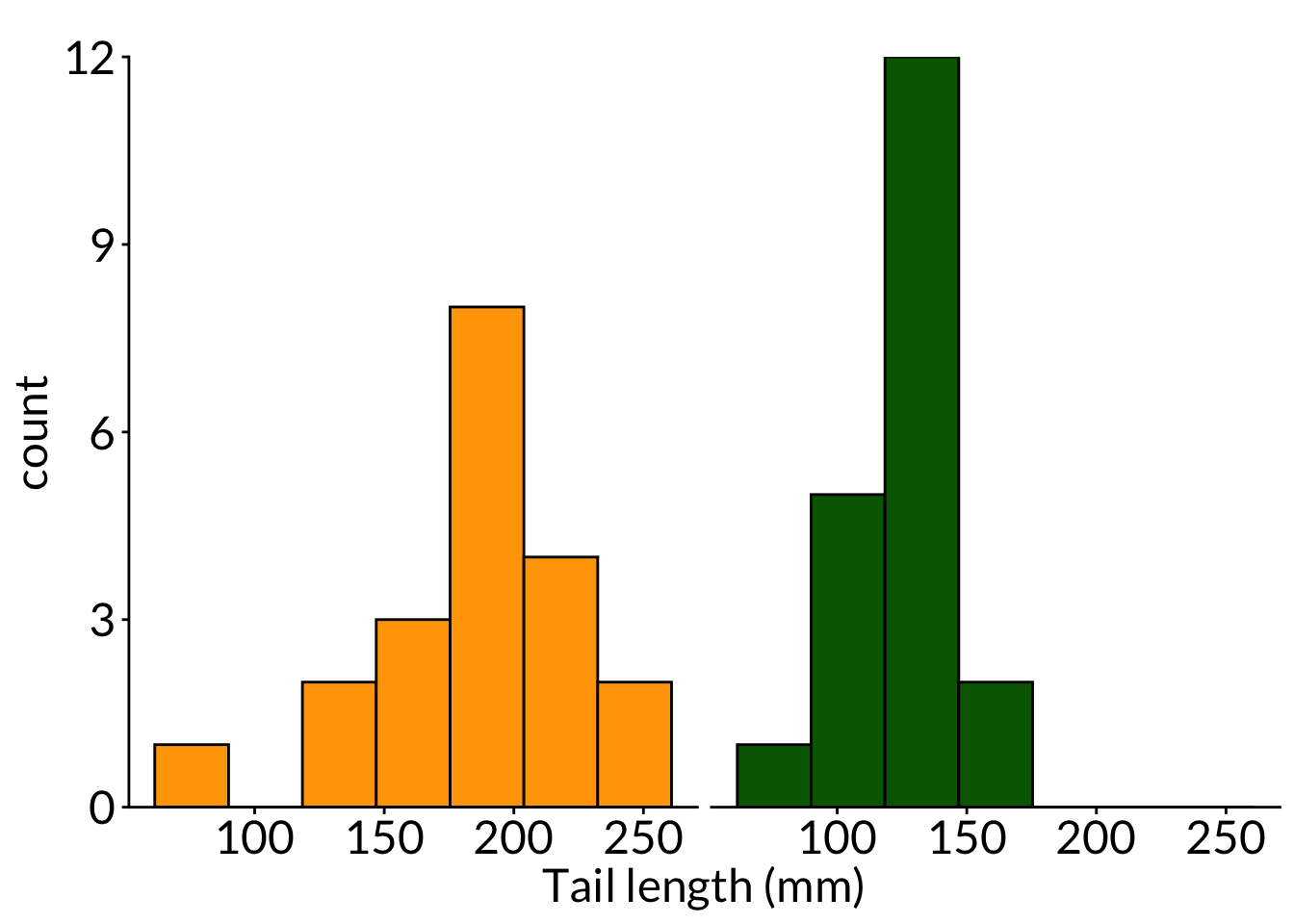 ex3 <-ggplot(data.frame(x =-8:17), aes(x)) +stat_function(geom ="line", n =100, fun = dnorm, args =list(mean =0, sd =2), linewidth =2, color ="#FF6B2B") +geom_vline(aes(xintercept =0), color ="#FF6B2B", lty =2, linewidth =2) +stat_function(geom ="line", n =100, fun = dnorm, args =list(mean =10, sd =2), linewidth =2, color ="#00A38D") +geom_vline(aes(xintercept =10), color ="#00A38D", lty =2, linewidth =2) +scale_y_continuous(expand =c(0, 0), limits =c(0, 0.21)) +theme_void() +theme(plot.margin =unit(c(1, 1, 1, 1), "cm"))set.seed(100)x <-rnorm(40, mean =0, sd =2)y <-rnorm(40, mean =10, sd =2)t.test(x = x, y = y, var.equal =TRUE)