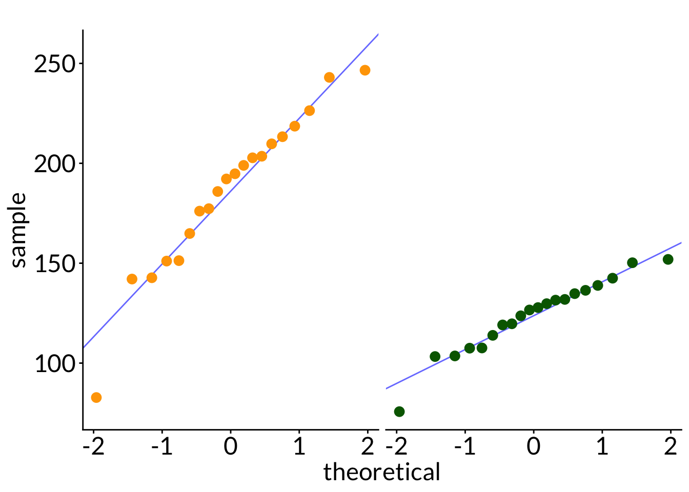 We use qqplots (quantile-quantile plots) to visually evaluate the normality of some variable. The x-axis is the “theoretical” quantile, and the y-axis is the “sample” quantile. If the points follow a 1:1 line, then the variable is normally distributed.