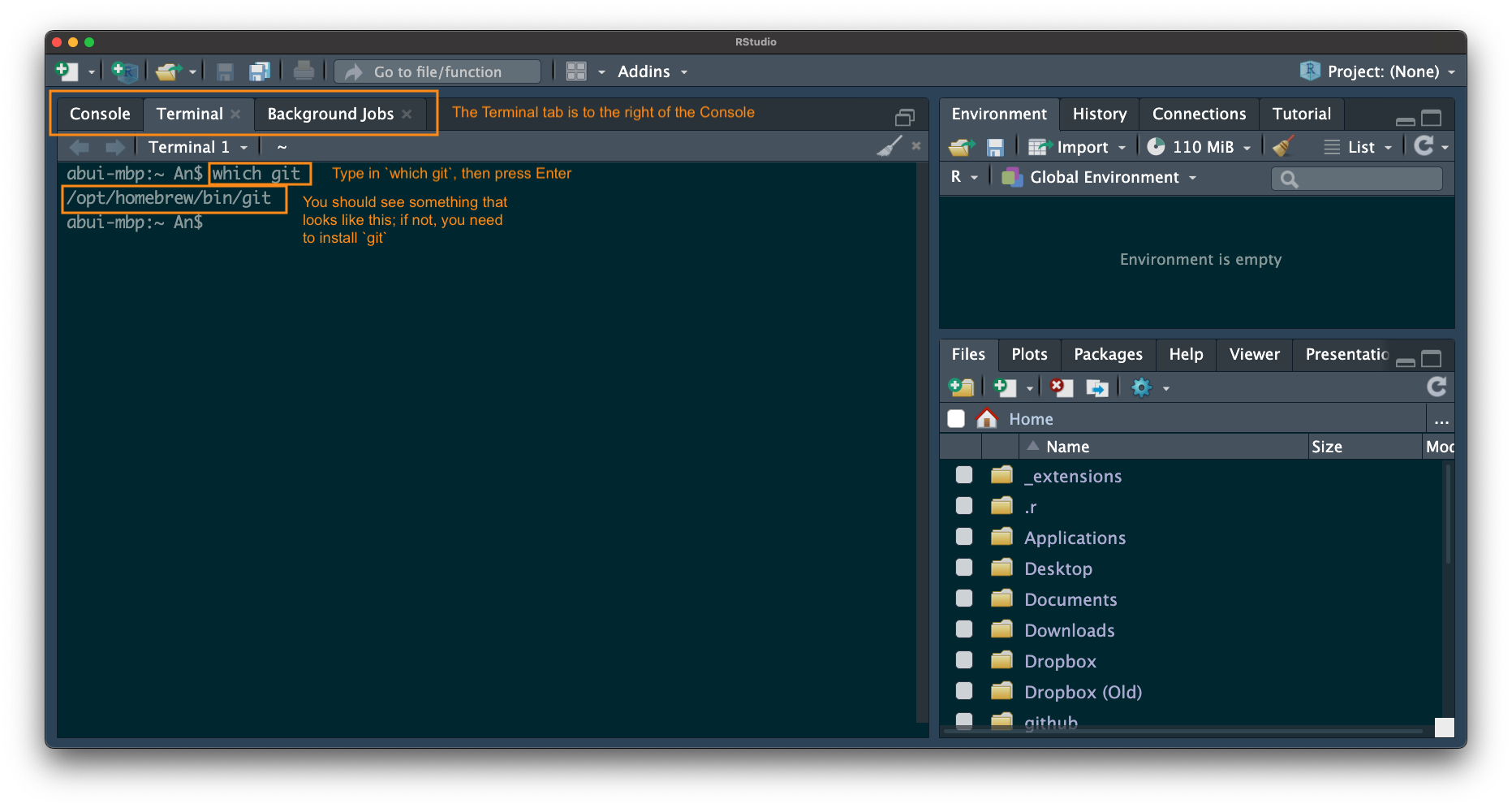 One easy way make sure that your folders are on your actual computer (again, not on OneDrive or iCloud) is to create a folder called git or github outside of cloud folders. On my (An’s) computer (which is a Mac), the file path to this folder is Macintosh HD > Users > An > github.