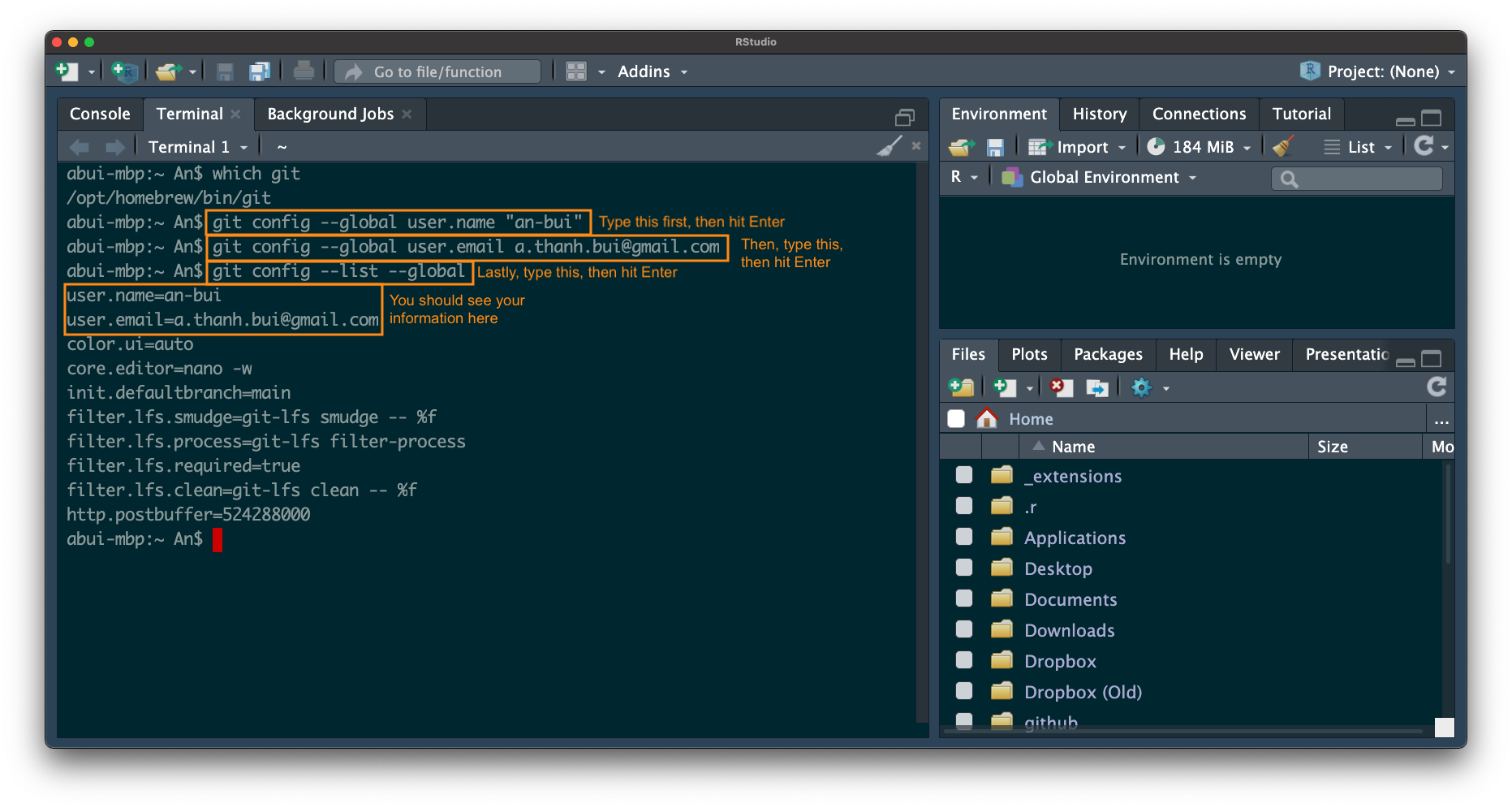 In the Terminal, type git config --global user.name "your-username-here" (replace your-username-here) with your actual user name. Hit Enter.