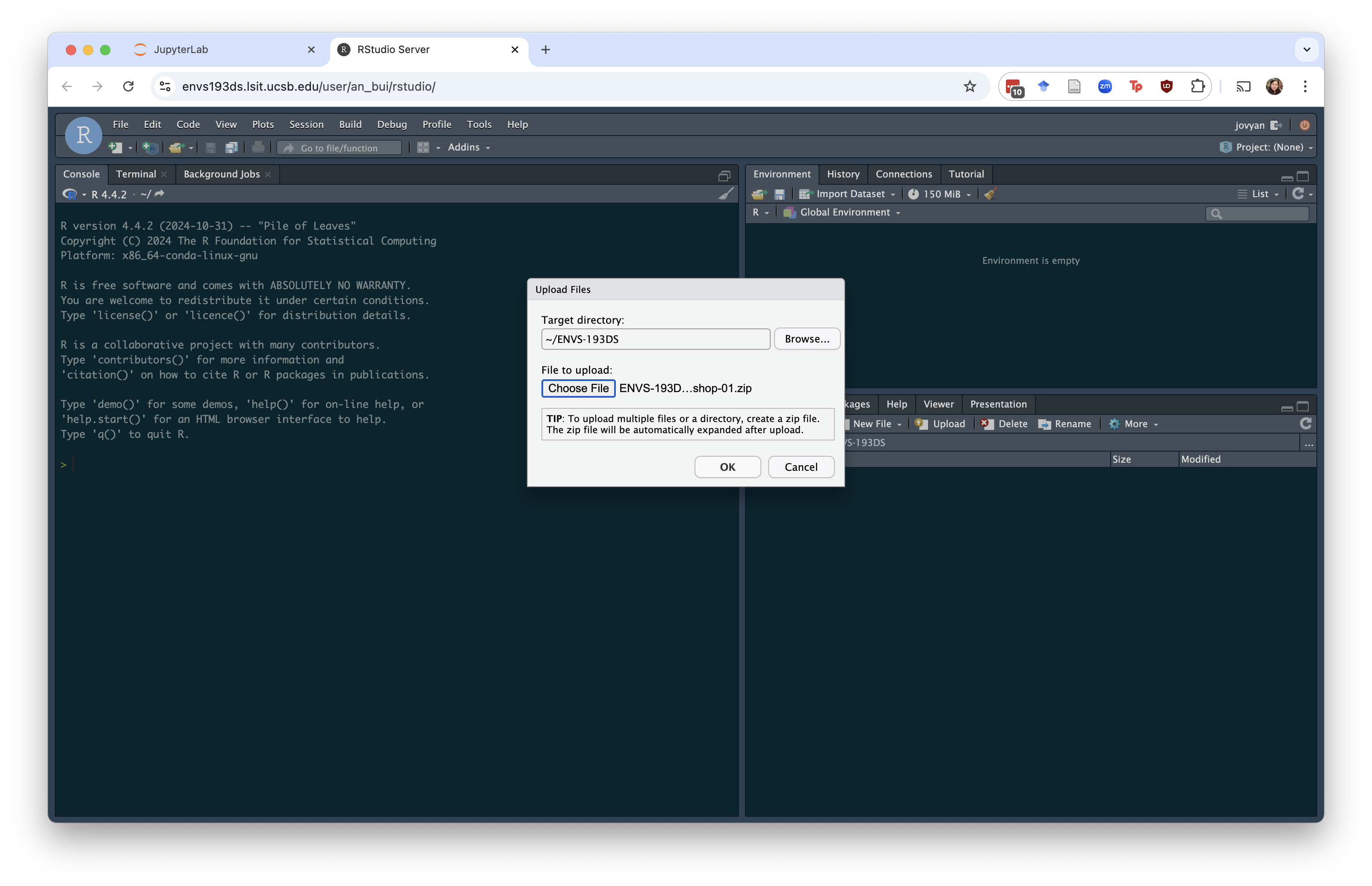 Download the zipped file of workshop materials from Canvas. Hit the Upload button (yellow arrow pointing up against a white paper). You should see a window that looks like this: