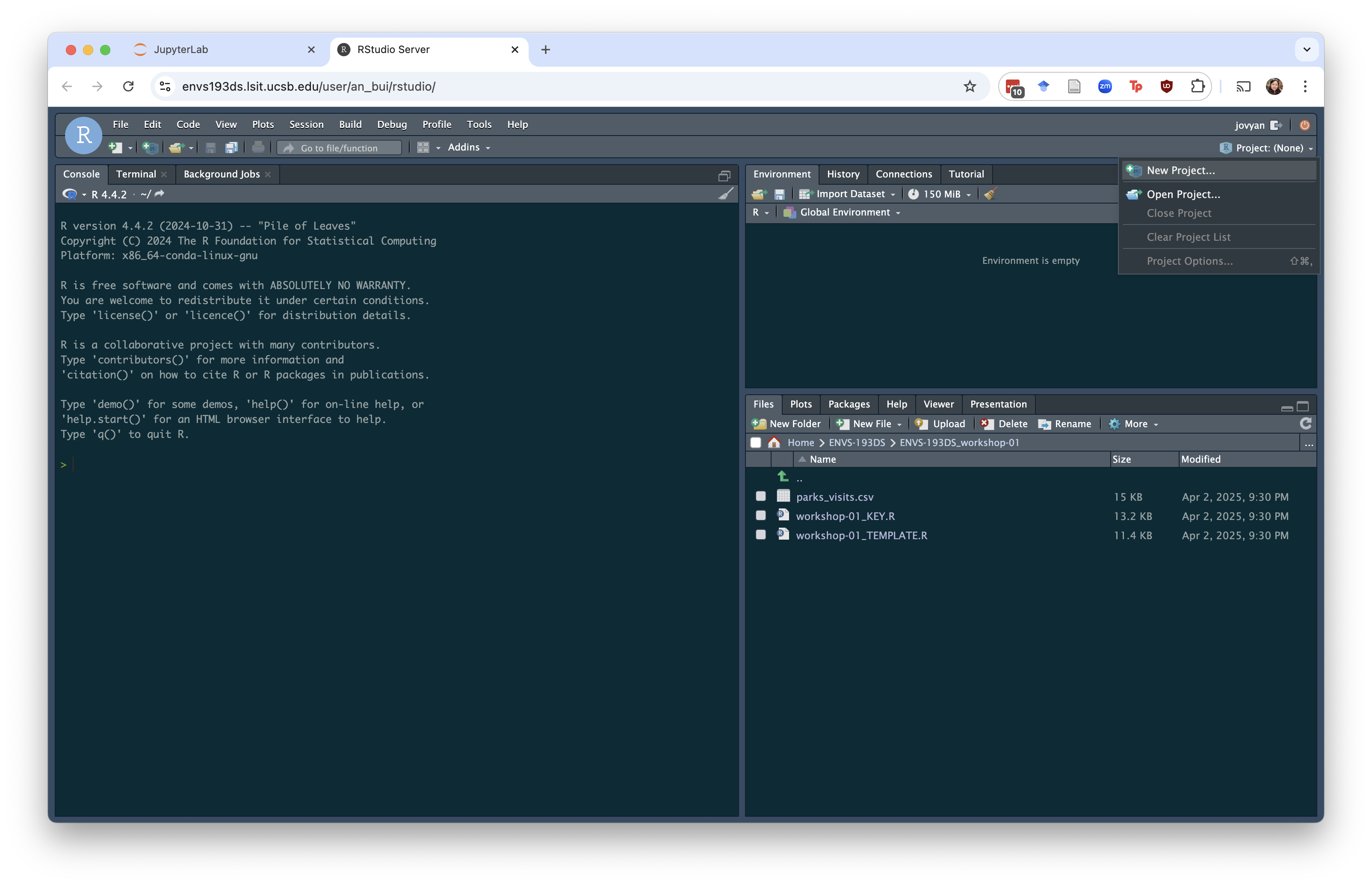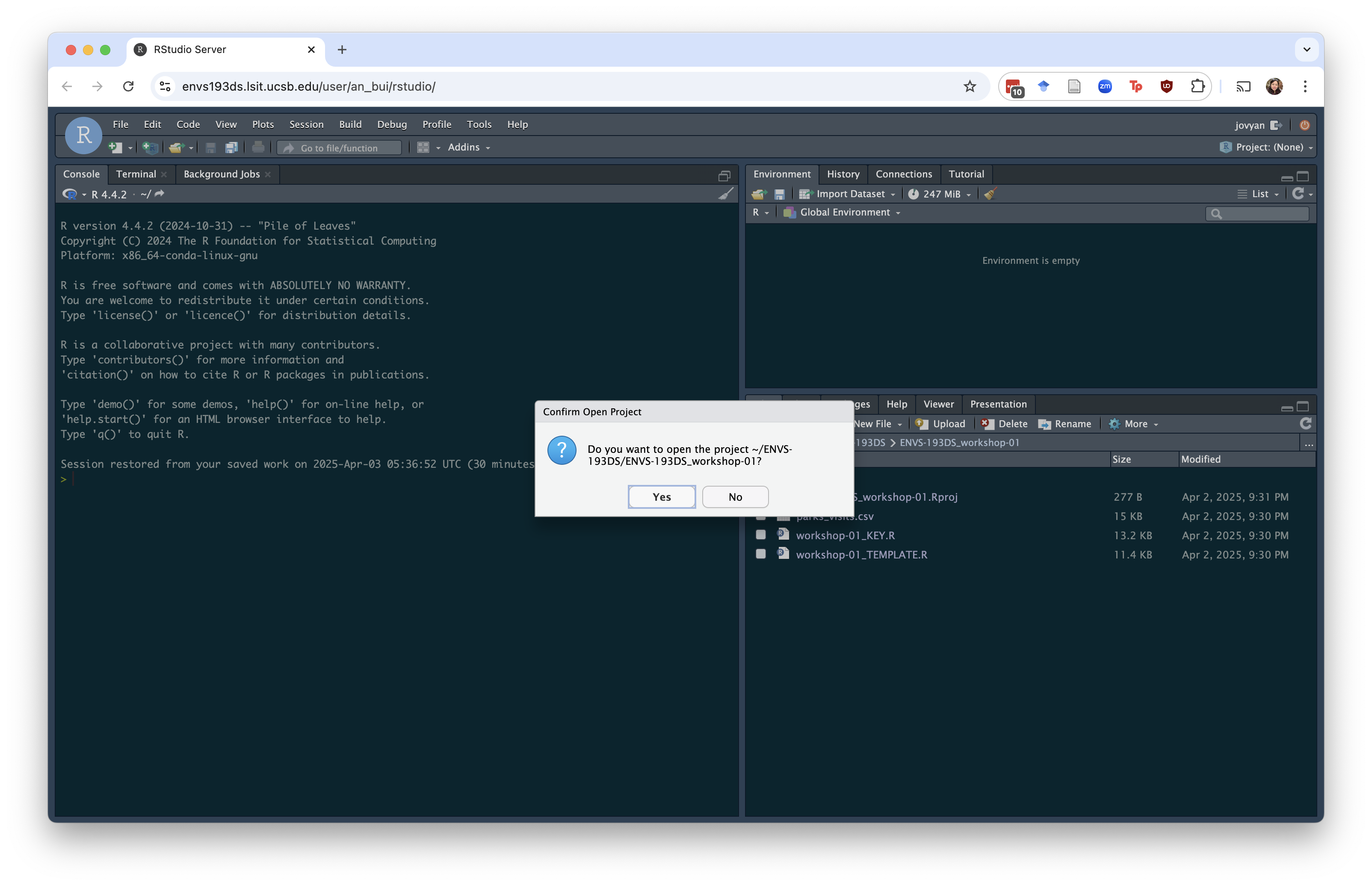 If you need to open your project again, navigate to the folder using the Files tab in the bottom right corner. Click on the .Rproj file. You will then see a window that looks like this: