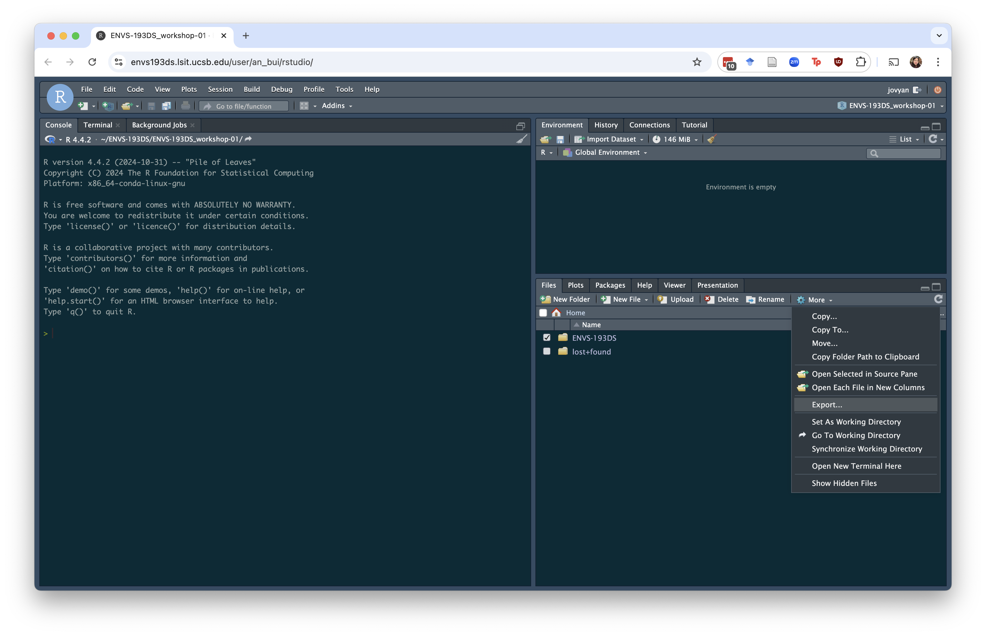 If you want to hold onto your files on your computer (for example, once the class ends), you can download a whole directory. Click on the folder you want to download and go to More > Export in the lower right pane.