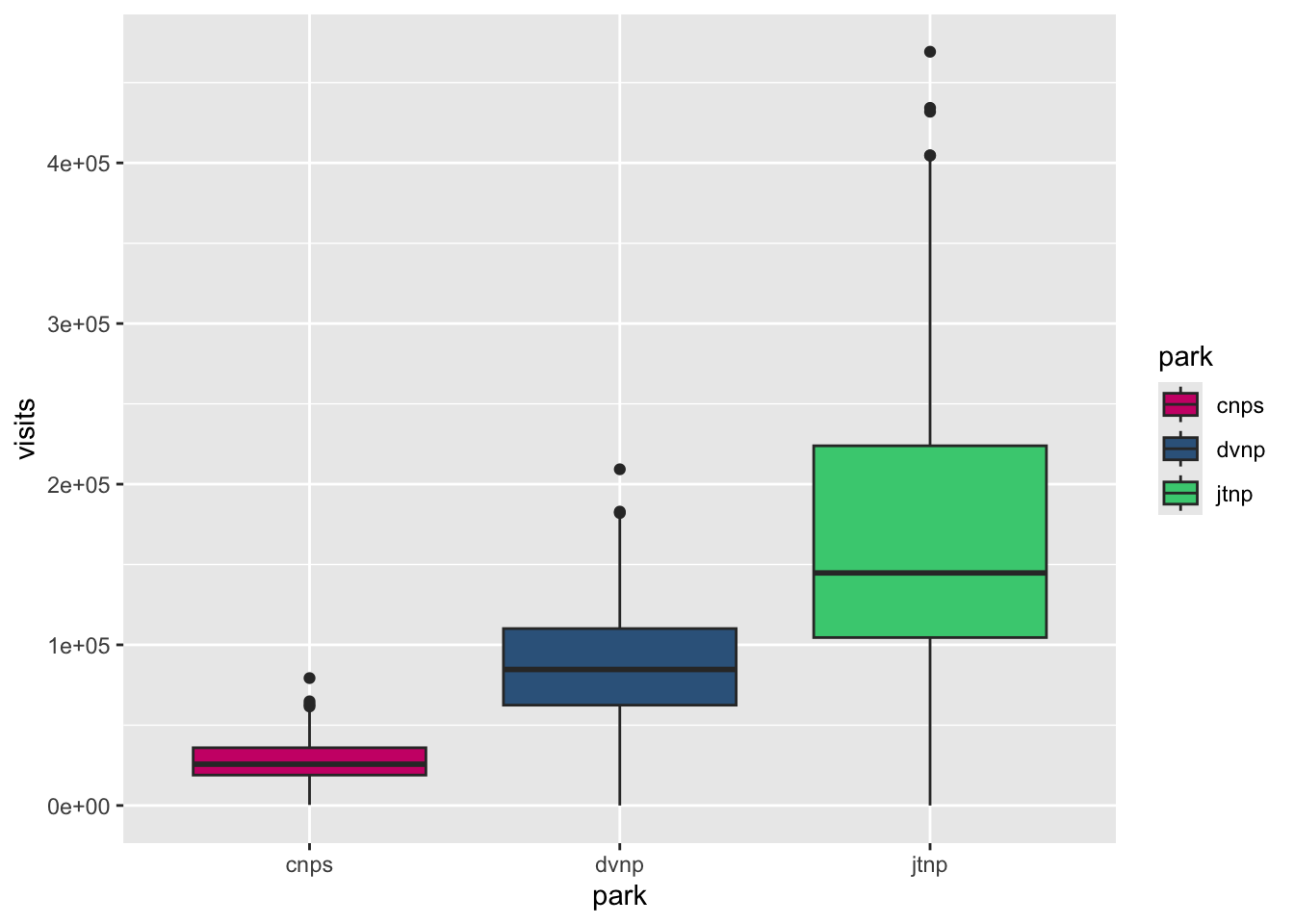 For example, the boxplot uses `fill = park`. The `park` column in the `parks_visits` data frame has three values: `cnps`, `jtnp`, and `dvnp`. That's why the `scale_fill_manual()` function contains a list of values using the abbreviations.