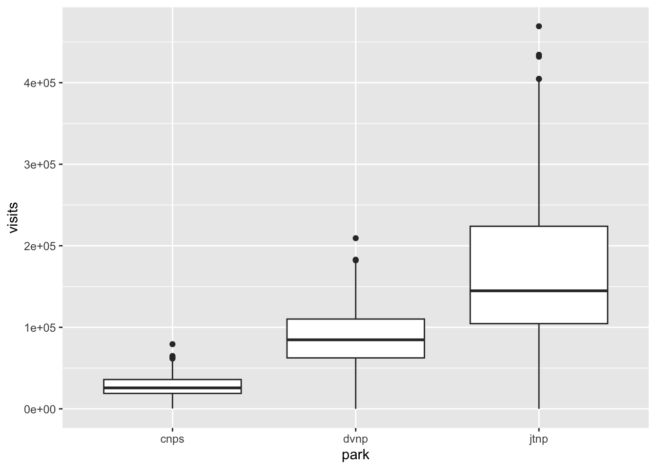 ggplot() by actually naming the functionparks_visits) and what the x- and y-axes should be using the aes() function (which stands for “aesthetics”)geom_boxplot() because we want to make a boxplot. Most geom_() functions are named after the plot they make.When you run the code to create this figure, you will get a warning message that looks like this: Warning message: Removed 1 row containing non-finite outside the scale range (stat_boxplot()).
