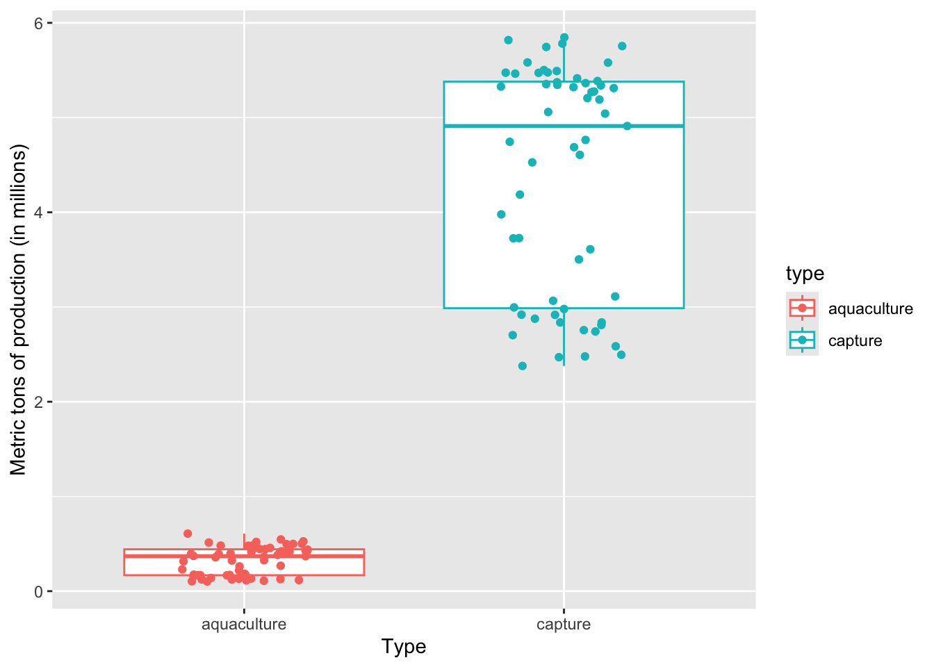 y = "Metric tons of production (in millions)") On average, a) which type of production produces more fish, and b) what components of the plot are you using to come up with your answer?