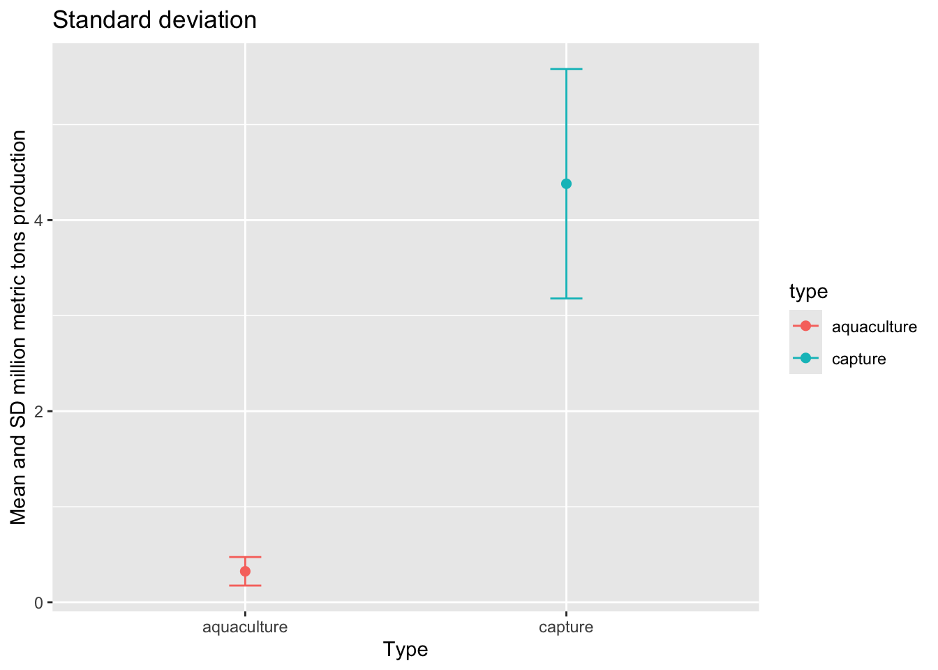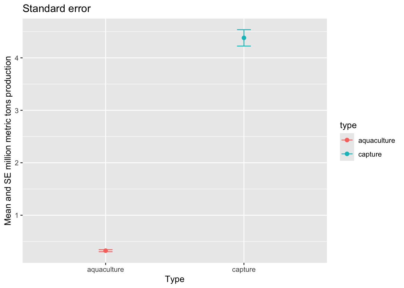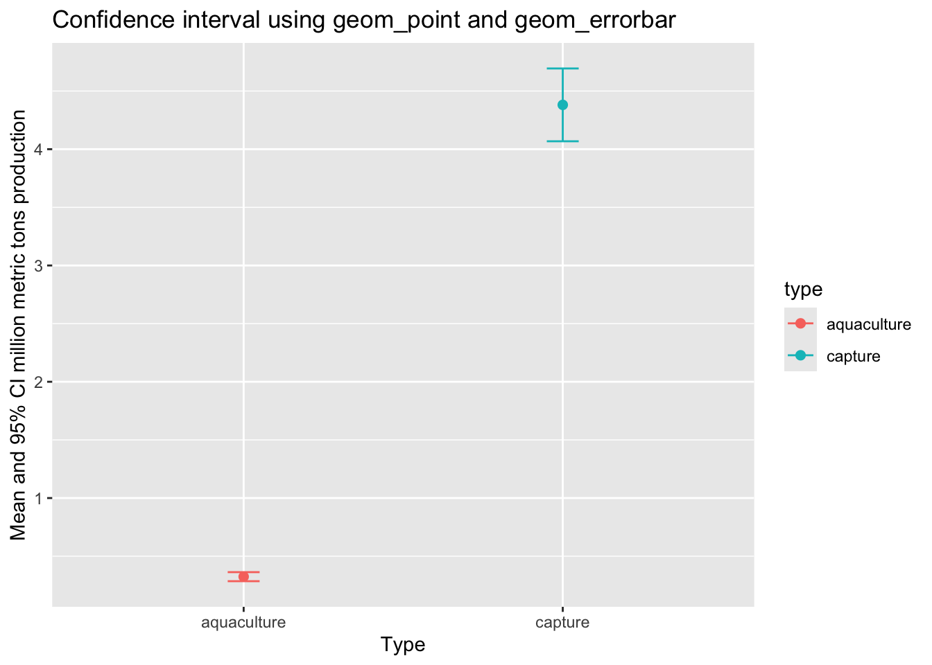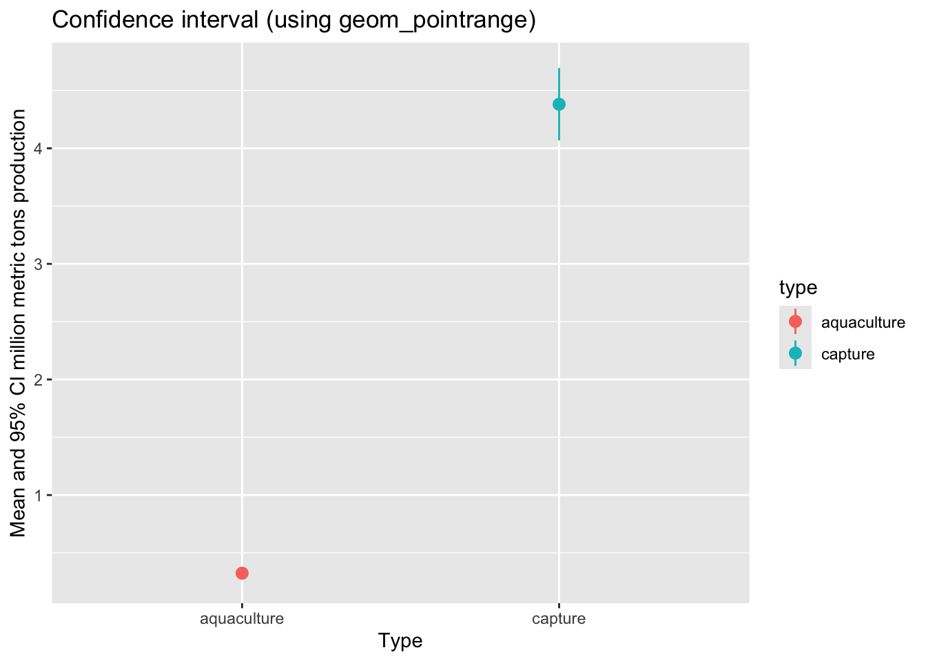 y = "Mean and 95% CI million metric tons production")c. geom_pointrange()