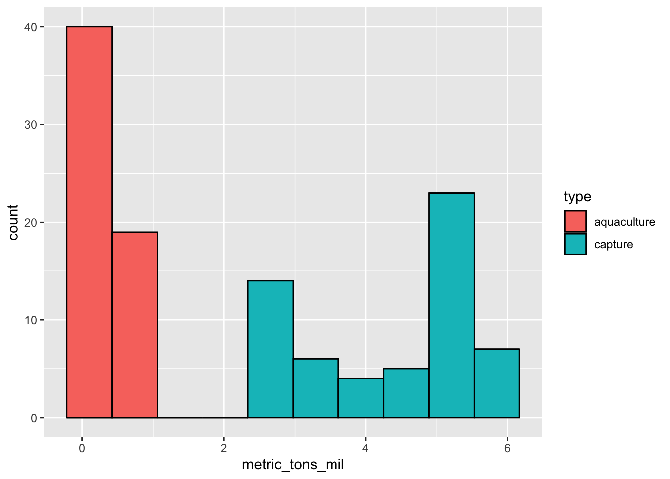 In class, we created a histogram that combined the distributions of metric tons of production for two groups: capture and aquaculture production.