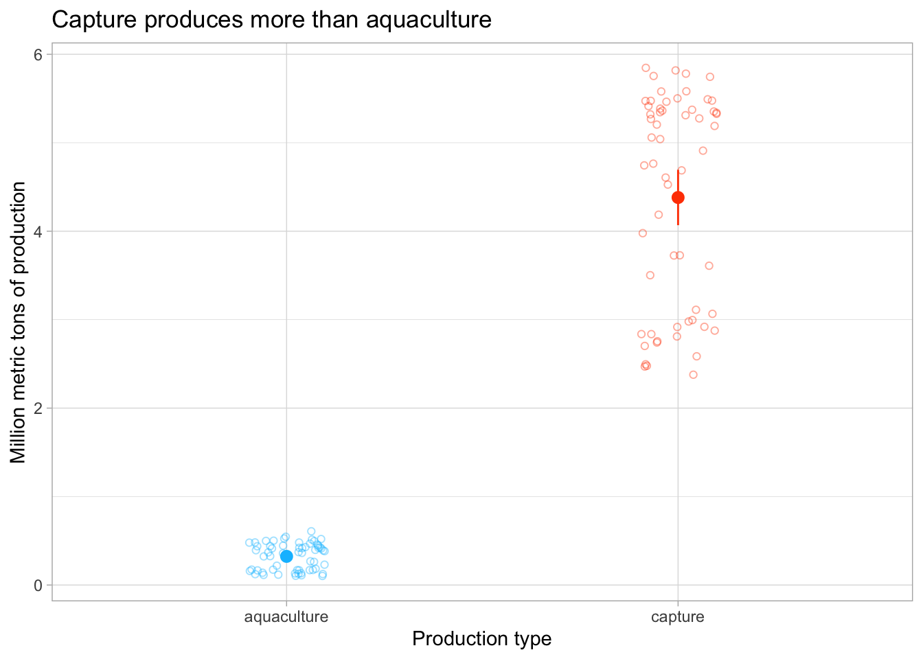 y = "Mean and 95% CI million metric tons production")d. Visualizing with the underlying data