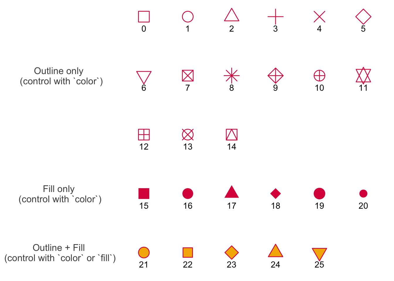This figure below shows the 26 options for shapes you can use in any plot with a point geometry.