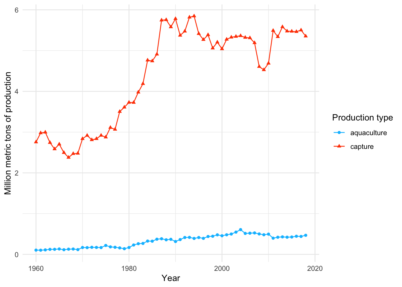 Before you start: think about what the differences might be between aquaculture and capture production in the context of fisheries. Which production type do you think would produce more seafood?
