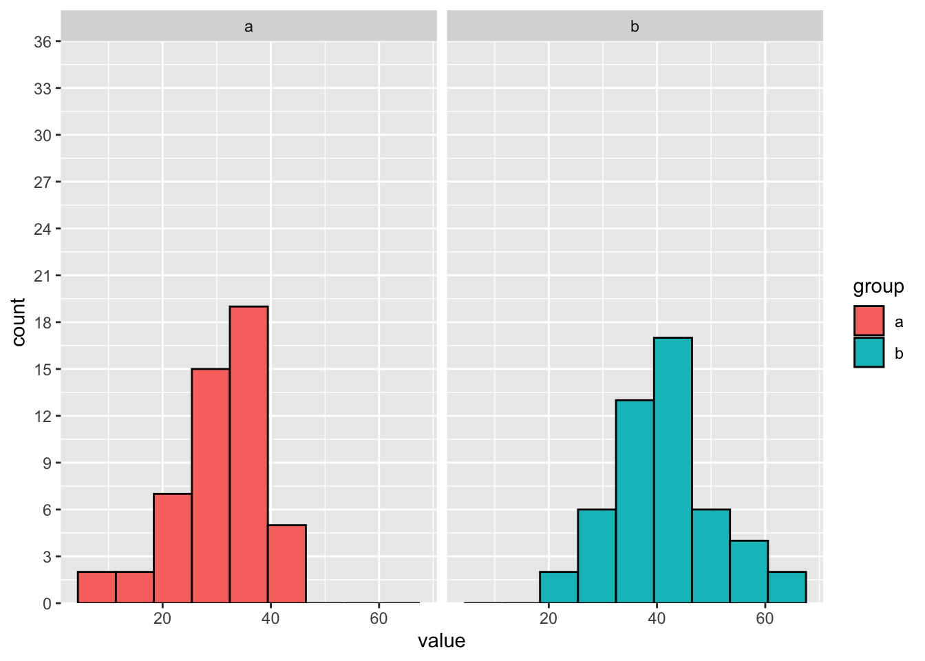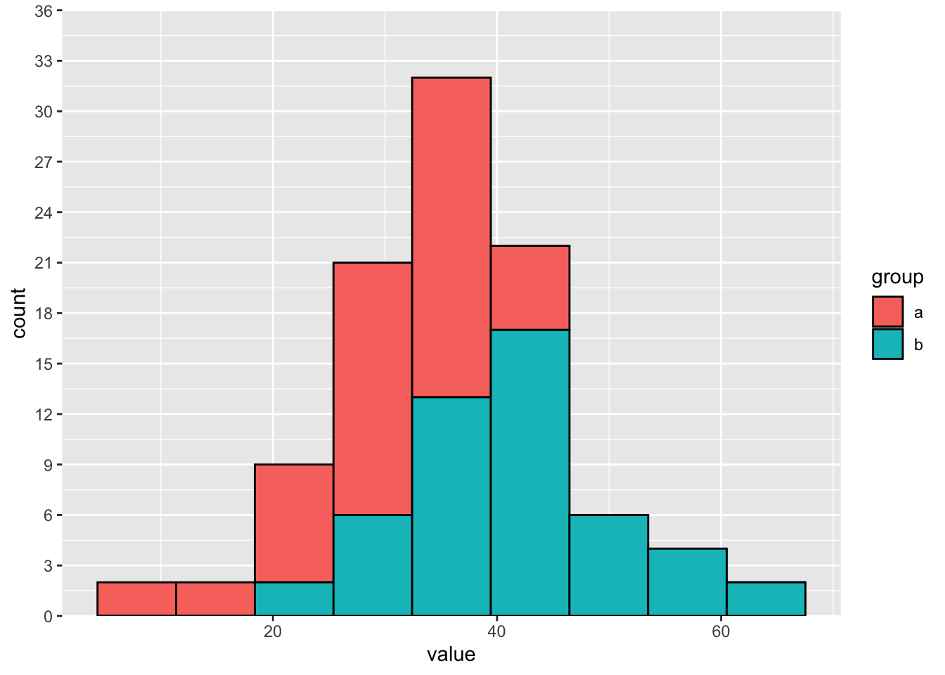 breaks = seq(from = 0, to = 36, by = 3)) If the distributions overlap, then the counts stack on top of each other.