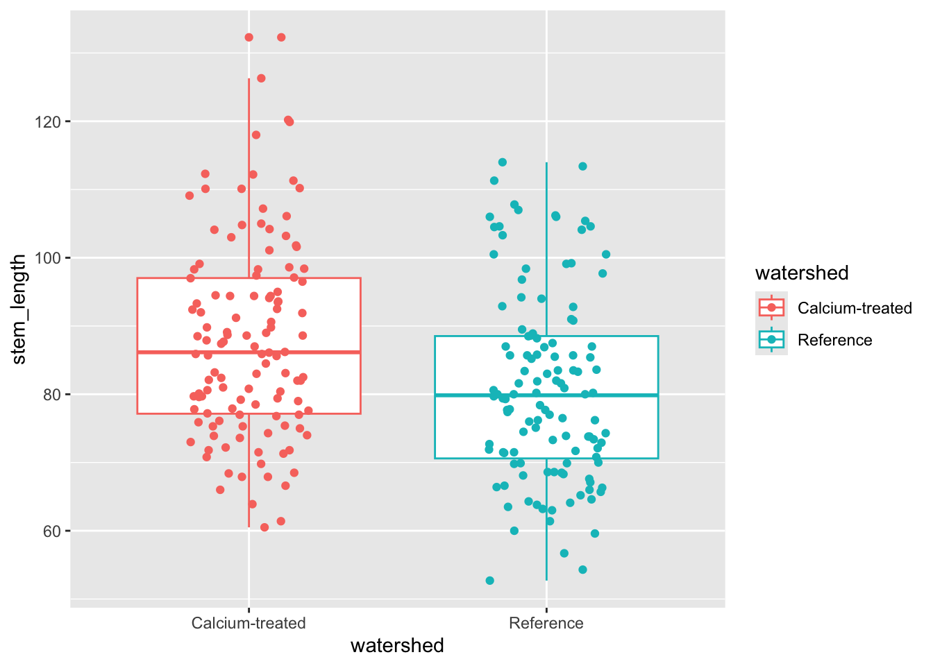 Insert a code chunk to make a boxplot + jitter plot comparing stem lengths between watersheds. Remember to: