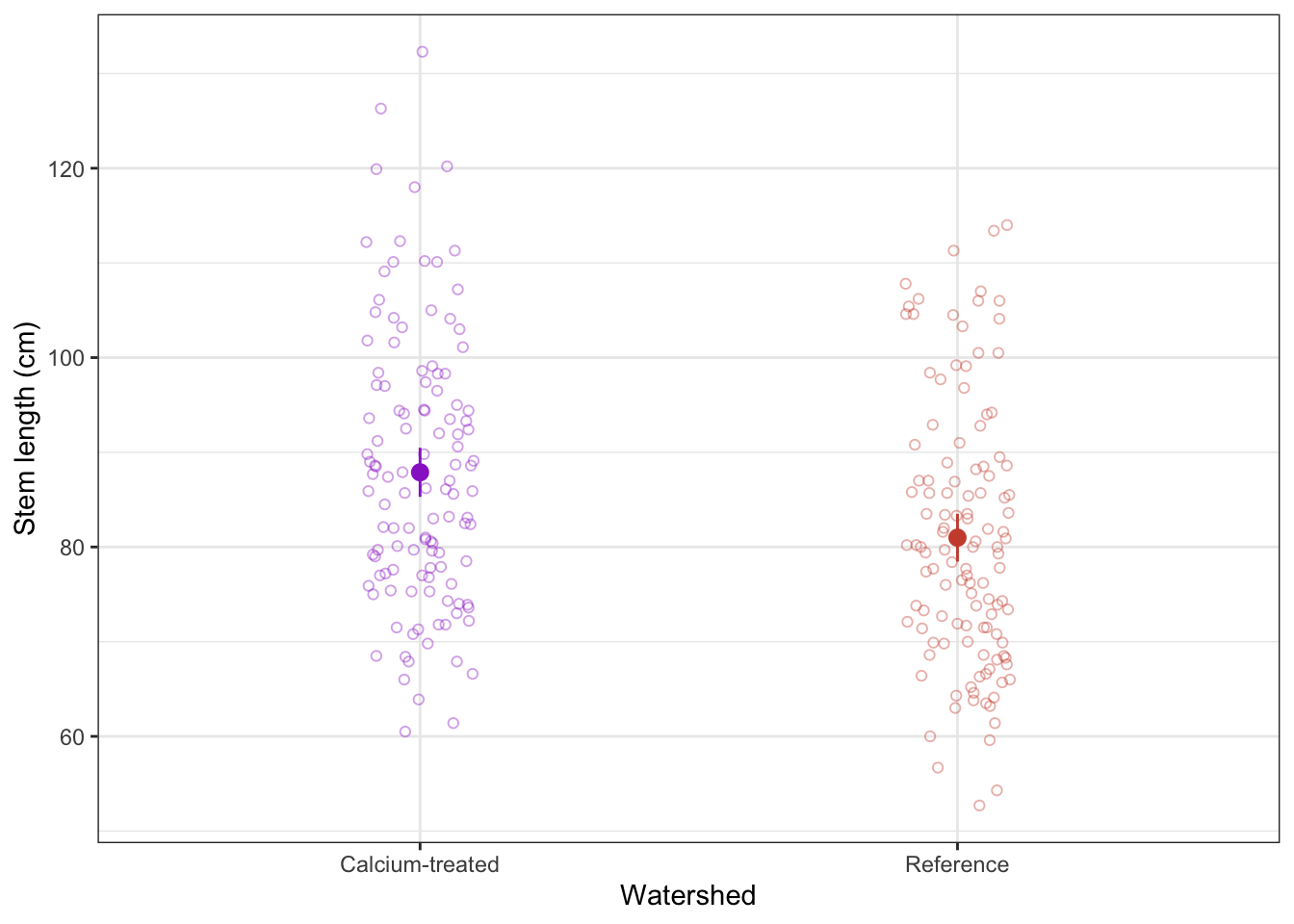 We found a significant difference in sugar maple stem lengths between calcium-treated (n = 120, mean = 87.9 cm) and reference watersheds (n = 120, mean = 81.0 cm) (Student’s t-test, t(238) = 3.8, p < 0.001, \(\alpha\) = 0.05).