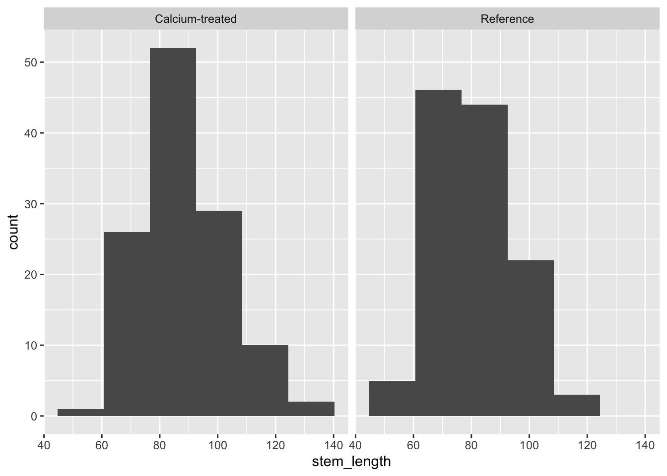 Because a) the distributions in the histogram look symmetrical and b) the QQ plot points follow the reference line comparing sample quantiles to theoretical (normal) quantiles, we can say that stem length seems to be normally distributed.